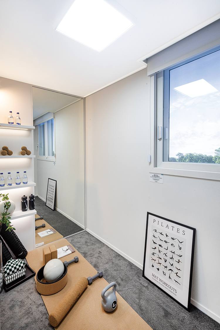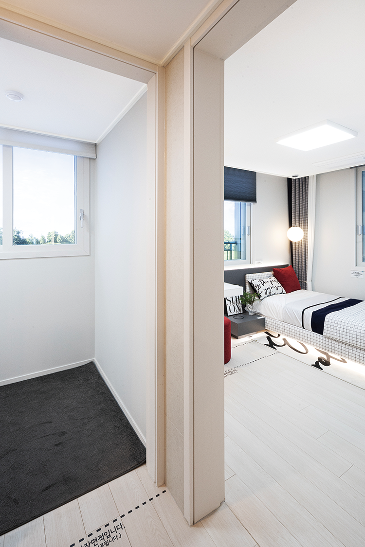 가변형 침실 침실 2, 3을 다양하게 활용할 수 있다. 침실 사이에 벽 대신 칸막이형 붙박이장을 설치할 수 있고, 각각의 침실에 슬라 이딩장을 설치할 수도 있다. 벽체를 없애고 침실 2, 3을 통합해서 사용해도 된다.