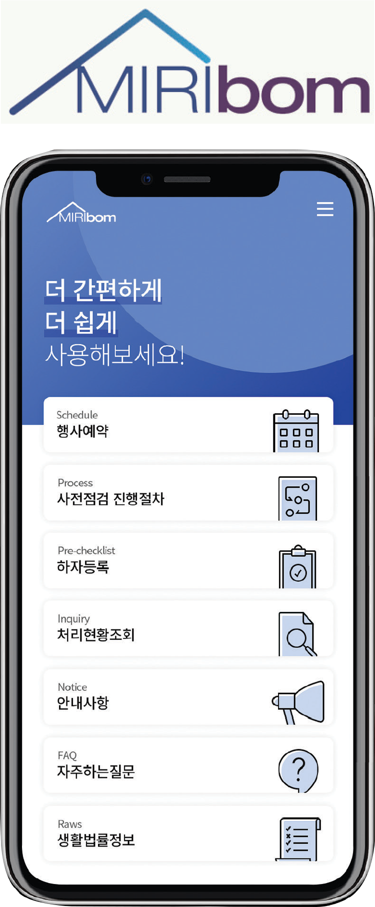 미리봄은 입주자 사전점검을 통한 입주 전 하자관리 서비스에 더해, 입주 후 하자보수에 관한 업무도 더욱 편리하게 처리하도록 협회에서 제공하는 모바일 플랫폼이다. 이와 더불어 입주예약 접수 기능 등도 제공해 회원사의 업무 효율을 높여준다.