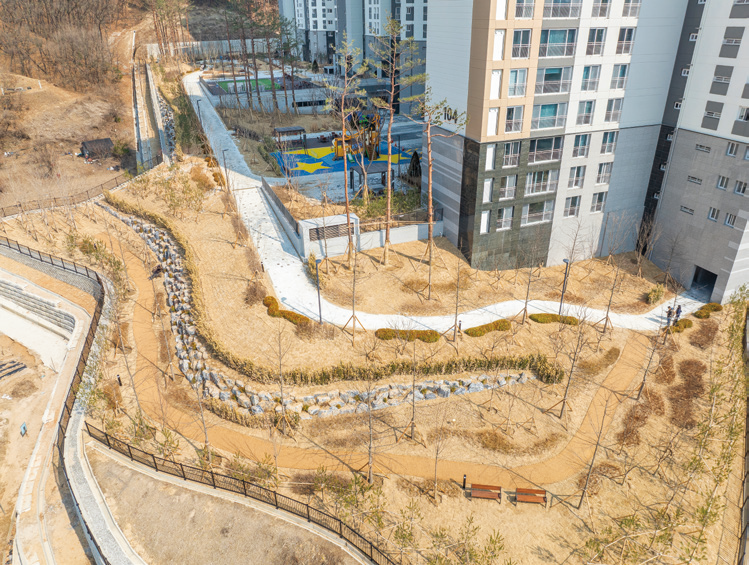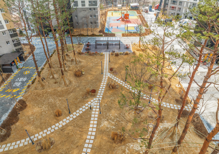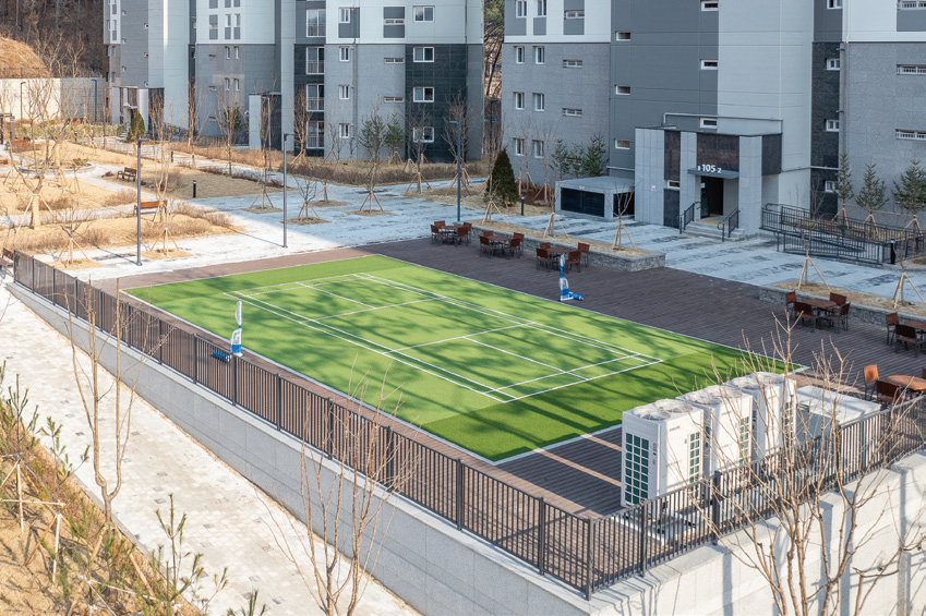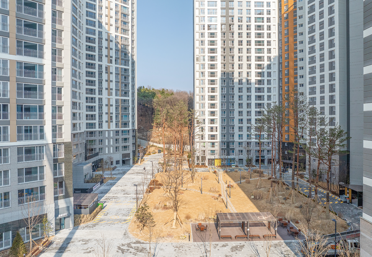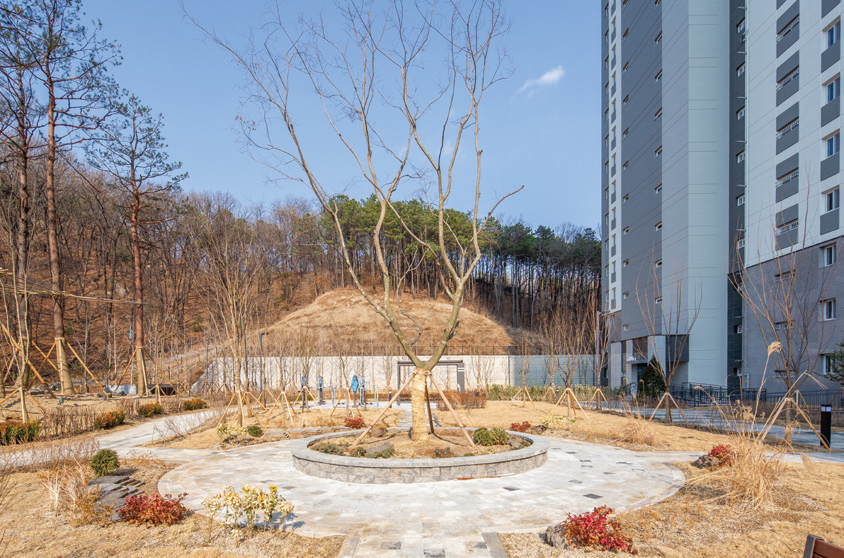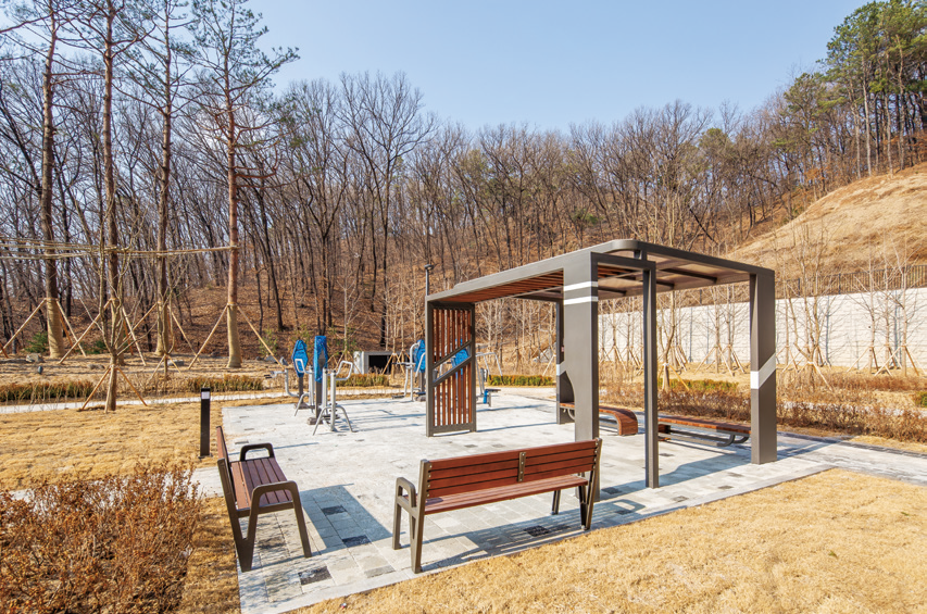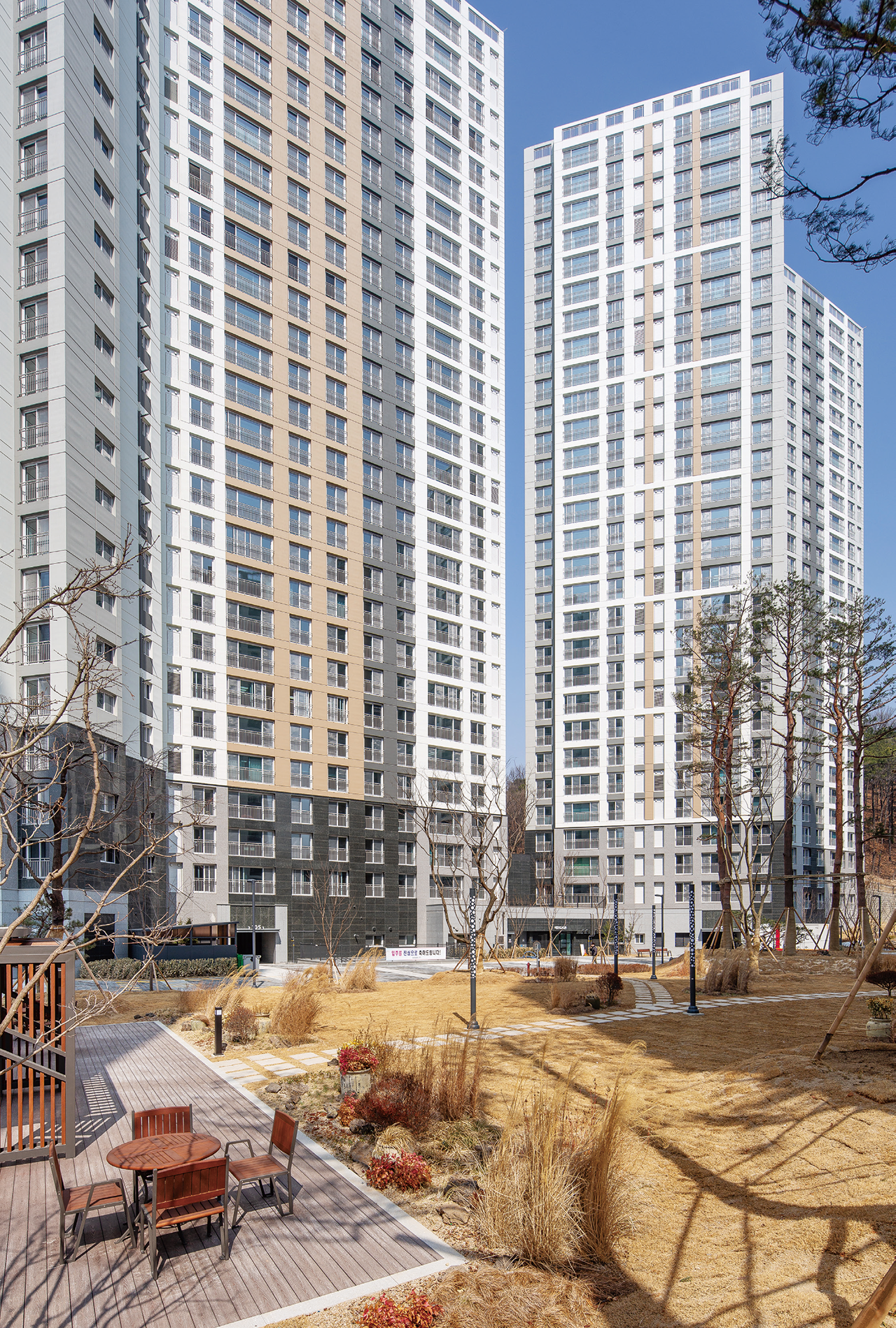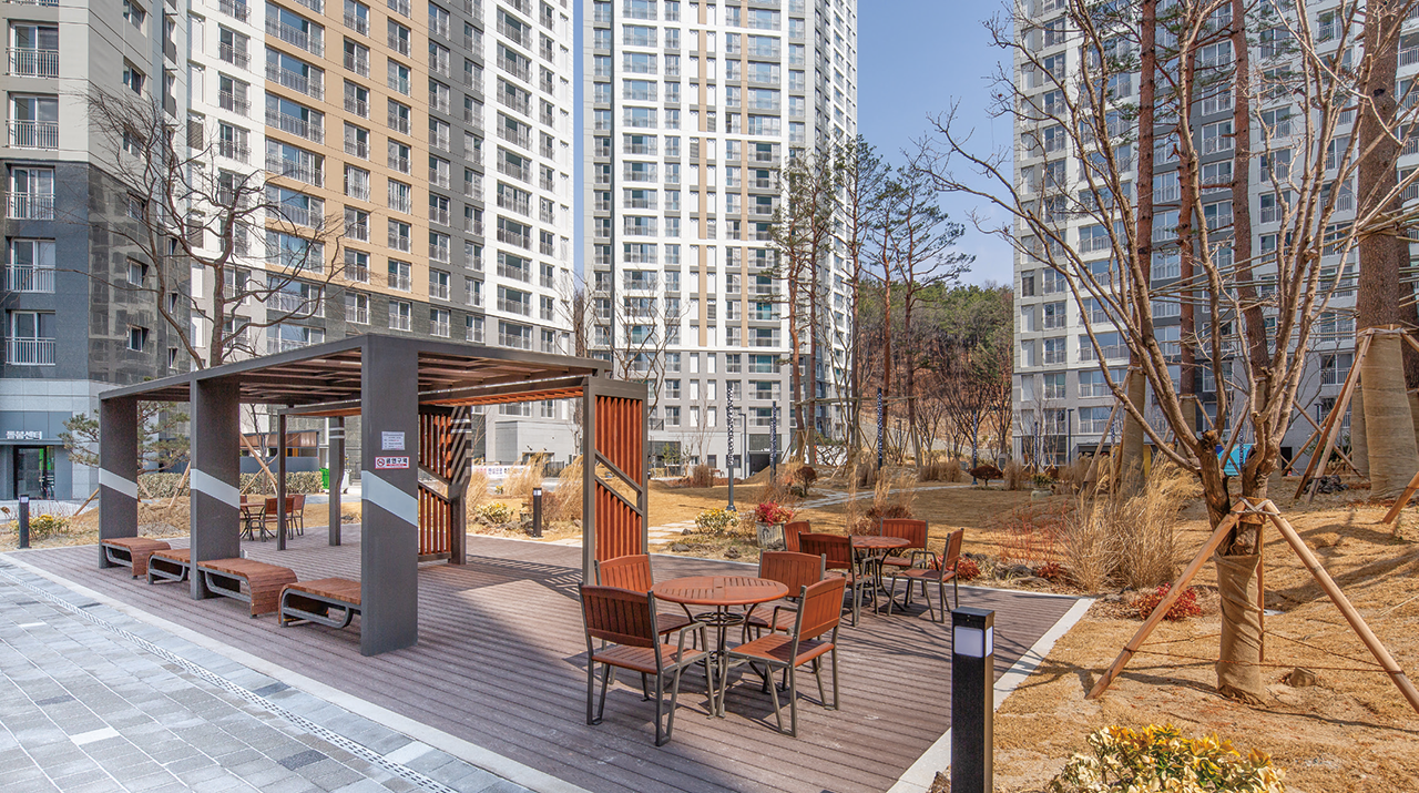 지방 도시에서는 보기 드문 지상에 차 없는 공원형 아파트라는 점도 강점이다. 조경면적을 48%나 확보하고 동간거리를 넓게 배치해 단지 내부가 쾌적하다. 조경작업에 심혈을 기울인 흔적도 역력하다. 높이가 최고 30m에 이르는 대형 소나무 48주를 단지 중앙광장과 외곽에식재해 단지의 품격을 높였다. 단지 곳곳에 조성된 쉼터와 산책로에는 대형 참나무, 느티나무, 팽나무 같은 다채로운 수종들이 자리해 다가올 사계절을 기대하게 만든다.