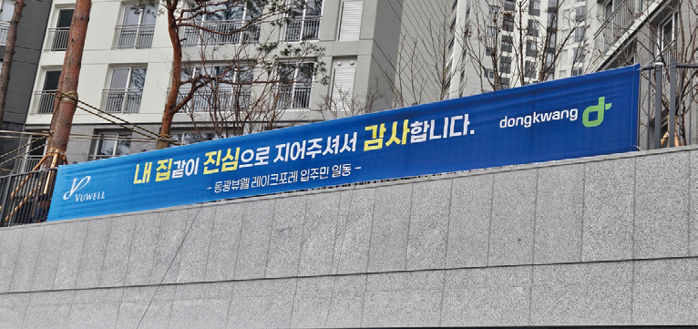 올해 1월 강원도 원주시 태장동 577-3번지 일대에 지하 3층, 지상 최고 28층, 6개동, 전용 84㎡, 총 604세대 규모로 등장한 ‘원주 동광뷰웰 레이크포레’가 원주시를 대표하는 최신식 공공지원 민간임대아파트로 주목받고 있다. 원주시 공동주택 품질검수단으로부터 시공품질에 대해 높은 평가를 받았을 뿐만 아니라, 입주자 사전점검에서도 호평을 받으며 입주민들로부터 감사의 플래카드를 선물 받기도 했다.