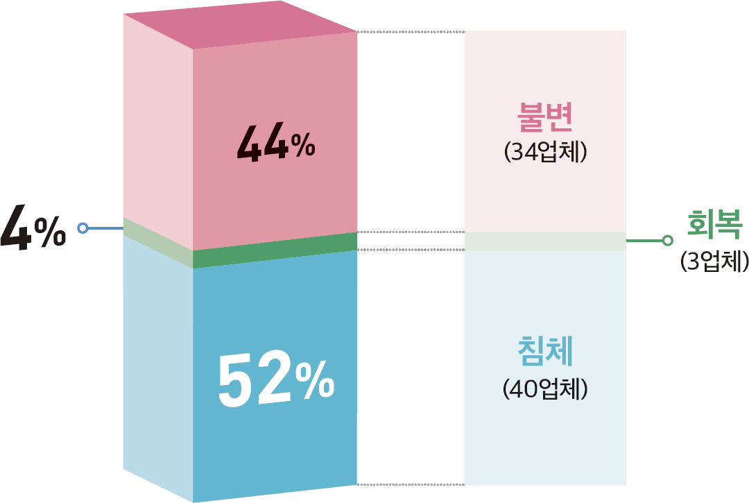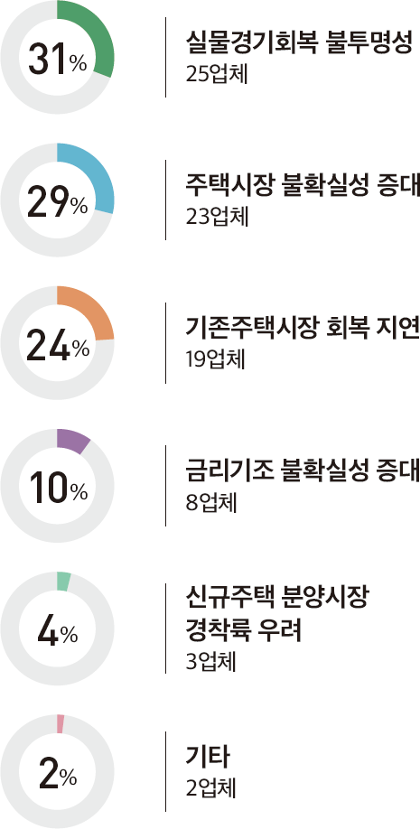 설문에 응한 77개 주택건설업체 중 40개업체(52%)가 2025년도 2분기의 주택경기를 2025년도 1분기보다 침체할 것으로 응답했으며, 34개업체(44%)는 2025년도 1분기와 비슷할 것으로 내다봤다. 이는 2025년 1분기 주택경기 전망〔침체(59%), 불변(37%)〕과 비슷한 수준이다.