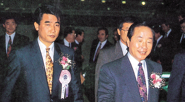 정치 인사와도 교류가 활발했던 허진석 회장. 1992년 주택건설인의 날 행사에 김영삼 민자당 총재와 민주당 김대중 대표가 참석한 모습이다.
