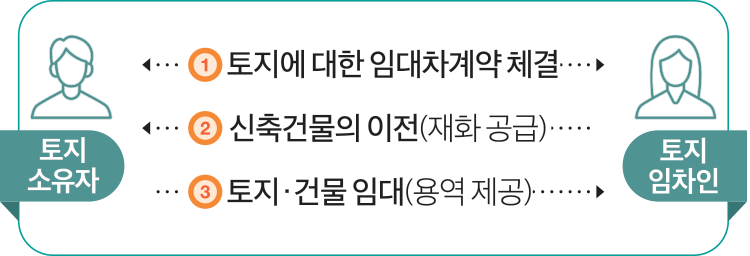 - 사업자가 타인 소유의 토지를 임차하여 건물을 신축한 후 일정기간 동안 사용하기로 약정하는 경우 토지 소유자와 토지 임차인 사이 재화의 공급과 용역의 공급이 다음과 같이 이루어진다.