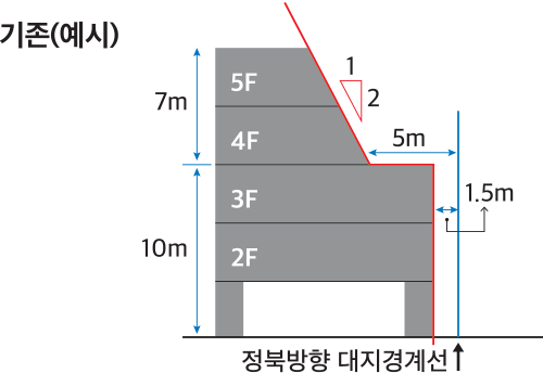 개정해설 전용주거지역이나 일반주거지역에서 건축물을 건축하는 경우, 건축물의 각 부분을 정북 인접대지경계선으로부터 건축조례로 정하는 거리 이상을 띄어 건축해야 한다.