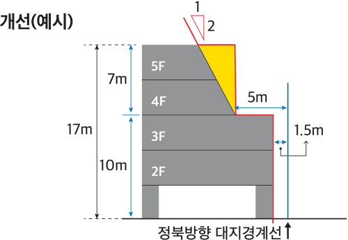 - 불법무단증축을 차단하려면, 정북 인접대지경계로부터 2m 이격하고 건축물 높이를 17m까지 건축할 수 있게 해야 베란다 불법증축 행위가 원천적으로 차단될 것으로 본다.