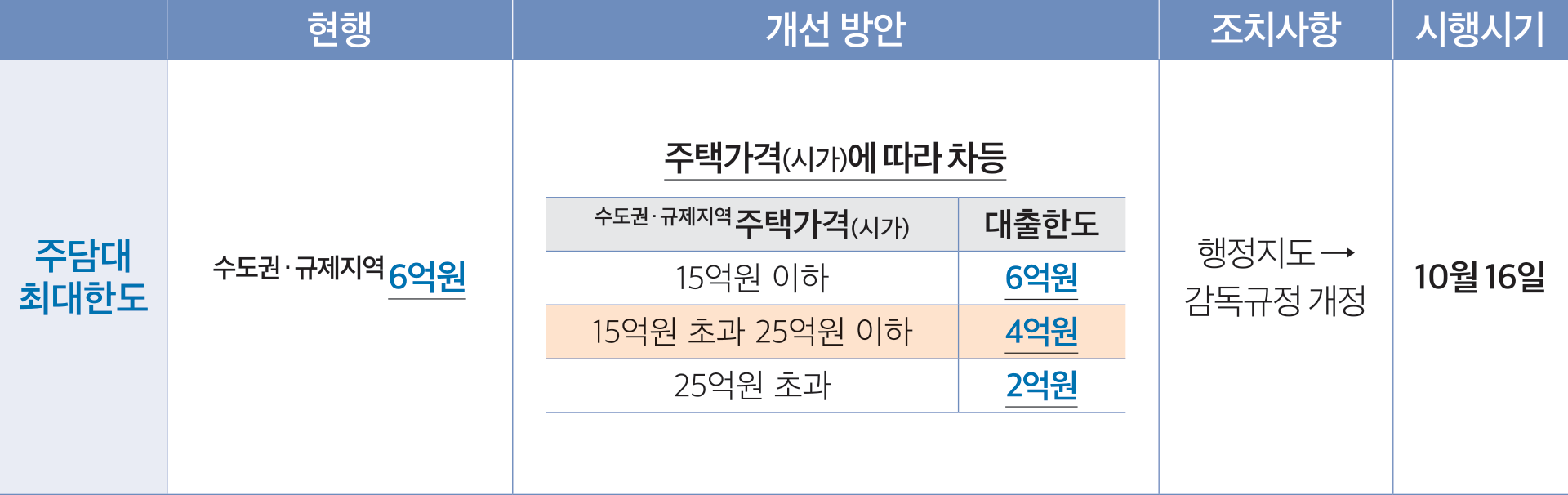 (스트레스 금리 상향 조정) 수도권 · 규제지역 내 주담대의 스트레스 금리를 1.5% → 3.0%로 상향 조정, 시행시기 10월 16일