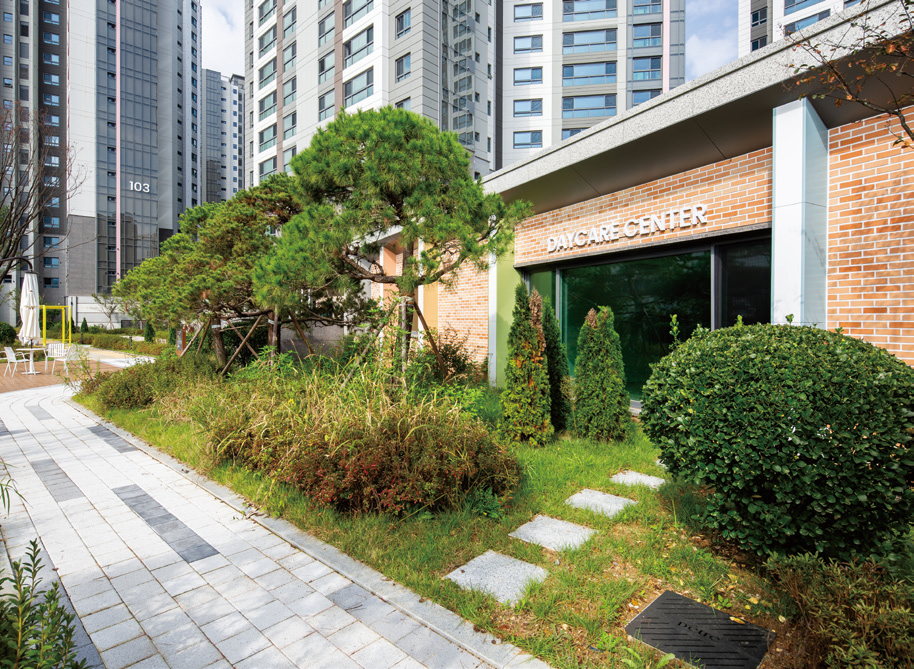 오봉산으로 이어지는 단지 산책로데크형주차장 출입구 18% 건폐율로 쾌적한 단지 내부