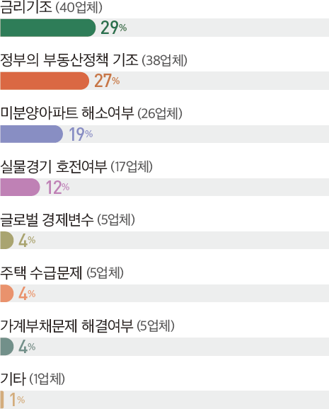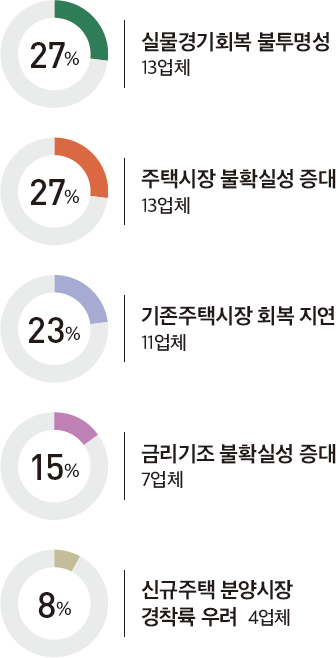 설문에 응한 72개 주택건설업체 중 32개업체(45%)가 2025년도 4분기의 주택경기를 2025년도 3분기와 비슷할 것으로 응답했으며, 24개업체(33%)는 2025년도 3분기 보다 침체될 것으로 내다봤다. 이는 2025년 3분기 주택경기 전망[불변(38%), 침체(32%)]와 비슷한 수준이다.