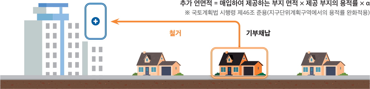 개발사업과 연계한 민간의 <사업구역 외 철거 특례>는 용적률 가산, 조합원 인정, 녹지확보 방안이 제안되고 있다. 용적률 가산은 개발사업시 사업구역 외에 있는 빈 건축물을 매입·철거한 후에 기부채납하면 해당 부지 면적을 용적률로 환산하여 제공하는 방안이다(<그림2> 참조).
