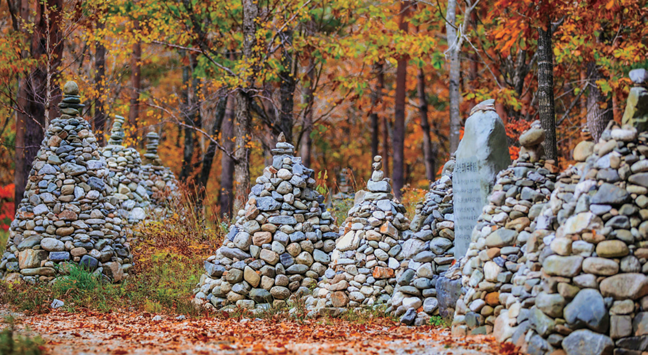 강릉 노추산 _ 강릉시 왕산면 대기리 노추산 자락에 가면 3,000개의 돌탑이 서 있는 신비로운 풍경을 마주하는데, 이곳은 ‘산신령 출몰 명소’로도 여겨진다. 탑골을 만든 이는 차순옥 할머니로 2011년 향년 68세로 세상을 떠나기까지 무려 26년간 이곳에서 돌탑을 쌓았다. 이후 TV 프로그램을 통해 입소문이 나면서 이곳은 모정탑길로 불리게 됐다.
