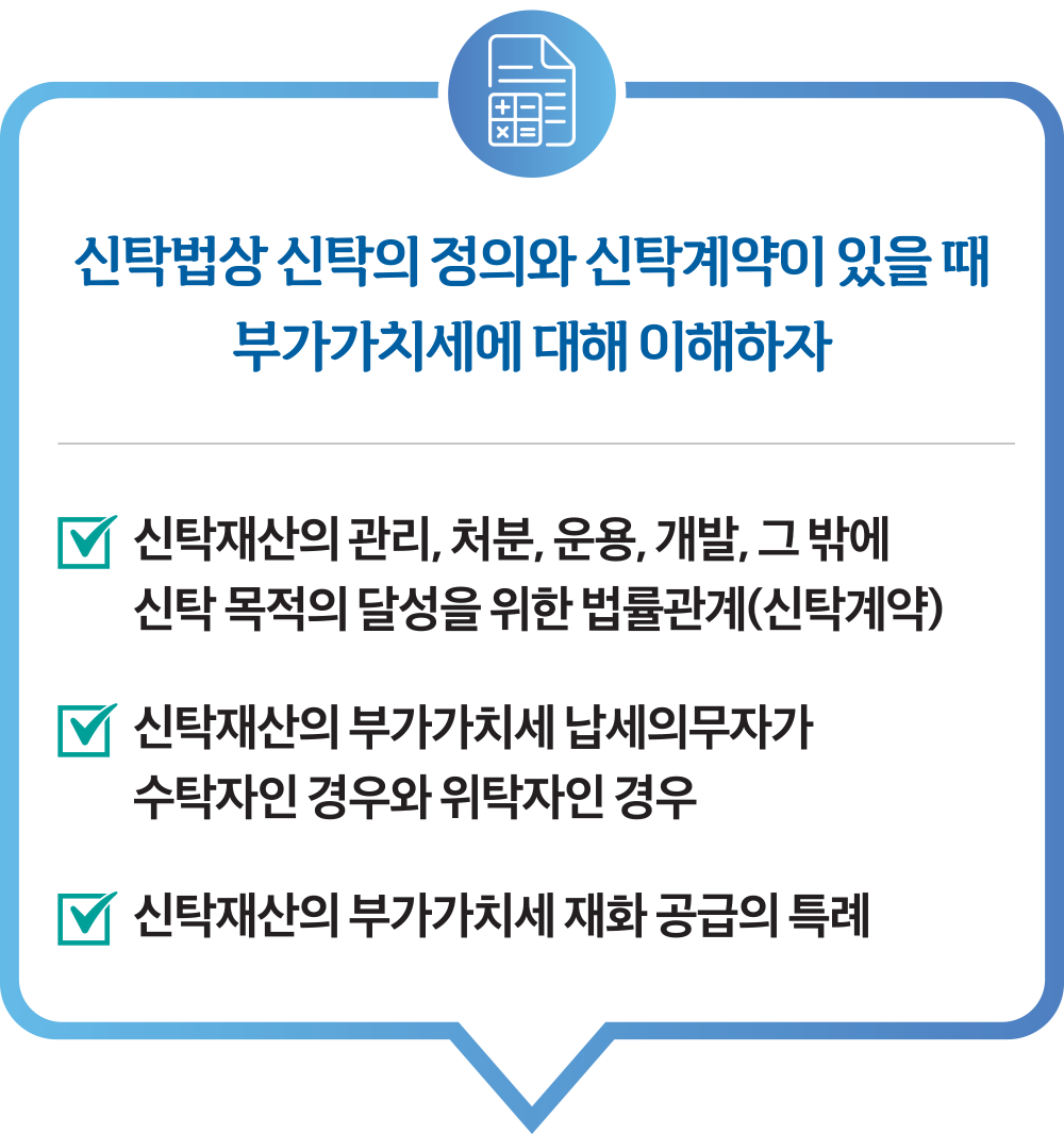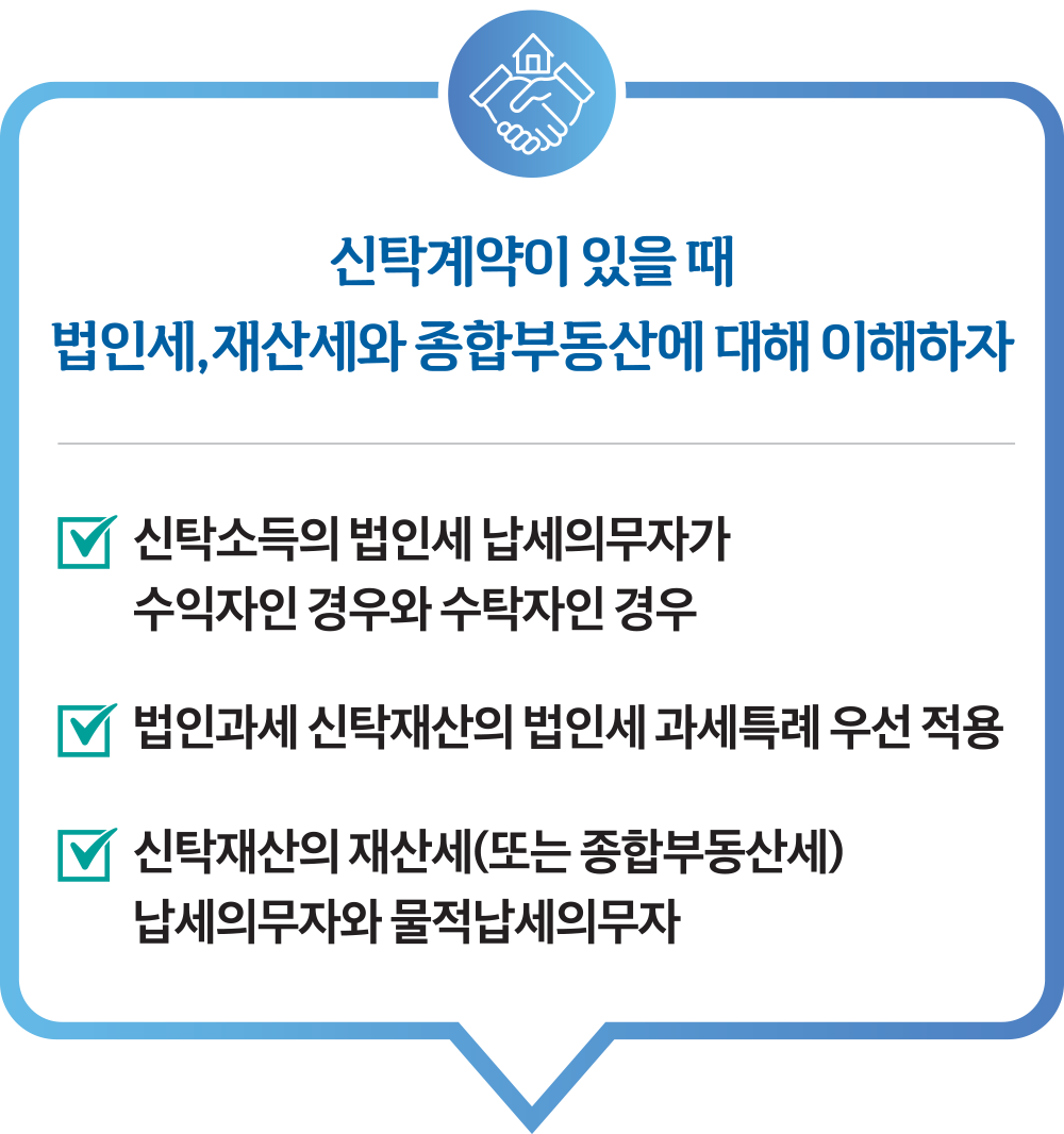 세법은 특히 납세의무와 관련해서 신탁계약 형태에 따라 납세의무자가 위탁자, 수탁자 또는 수익자 중 누가 되어야 하는지를 정하고 있어 신중한 판단이 요구된다. 아래에서는 신탁계약과 관련하여 부가가치세, 법인세, 재산세 및 종합부동산세의 세법 적용에 대해 주요 내용을 알아본다.