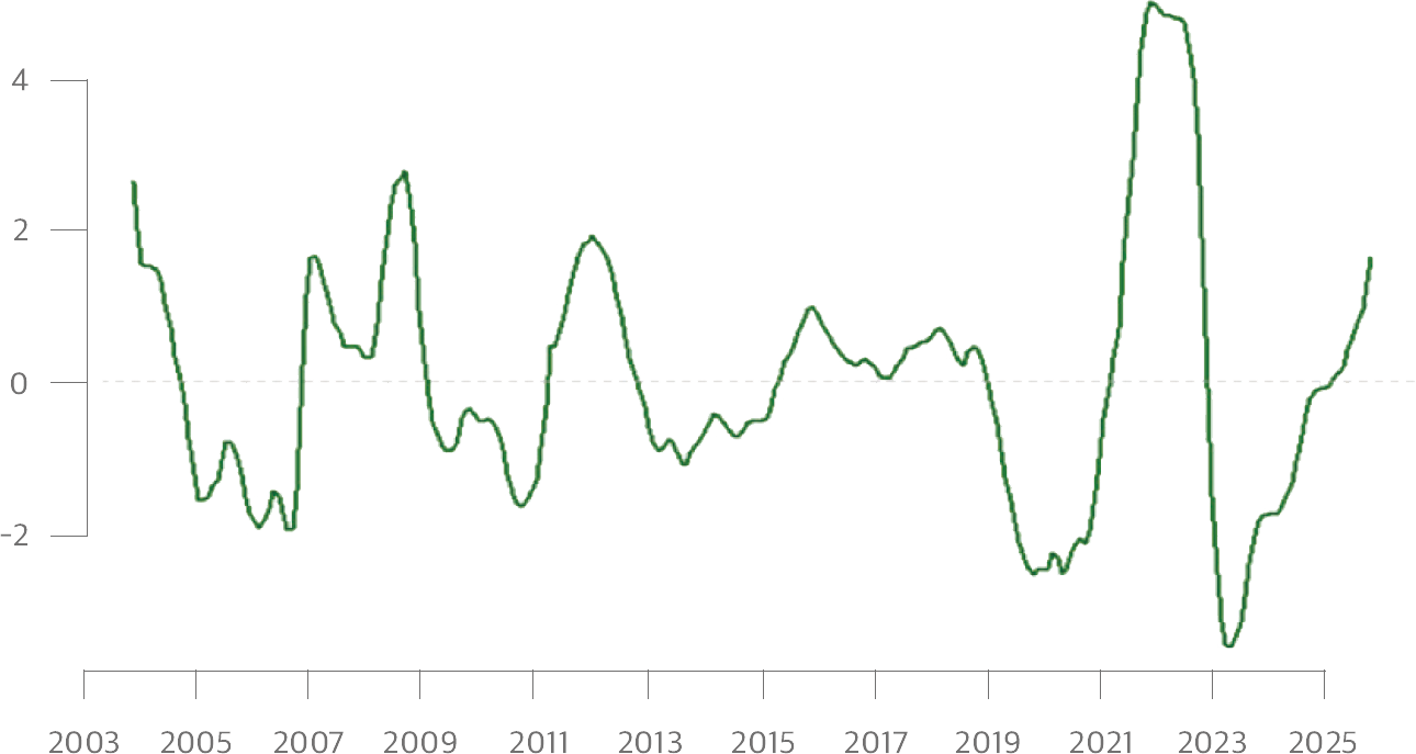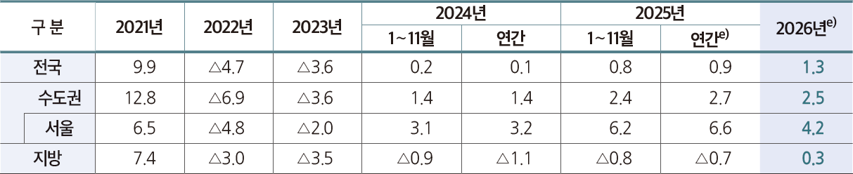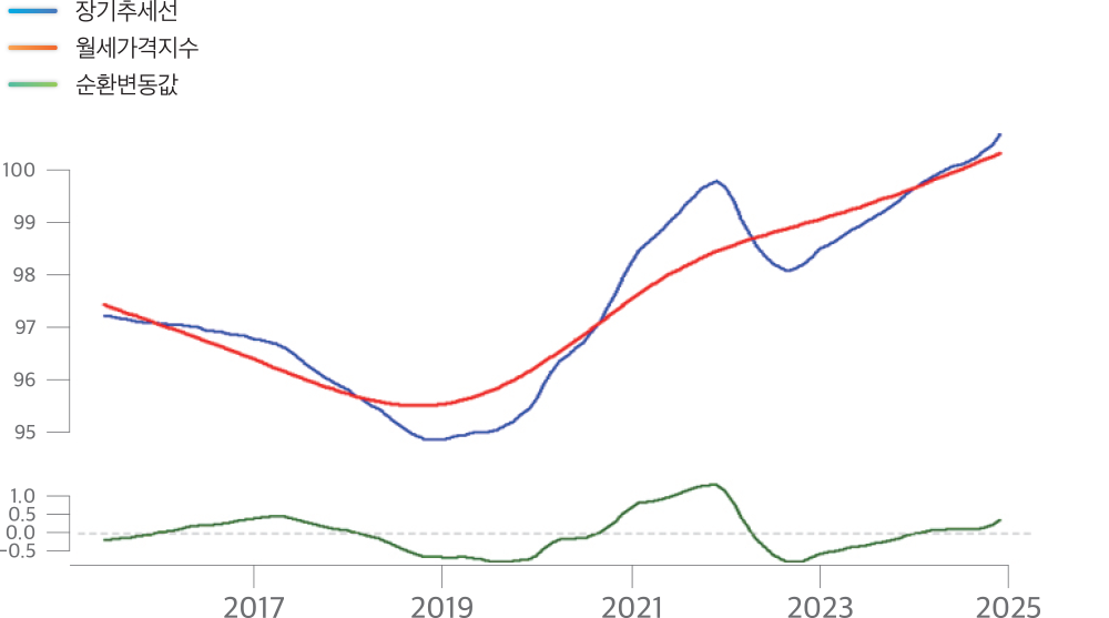 주택가격 순환변동모형 변동률 추세선으로 볼때, 주택가격은 2023년 조정국면을 마무리하고 2024년부터 안정화됐으며 2025년에는 순환변동값이 상회하는 구간으로 전환됐다. 2025년 11월까지 상승하고 있어 내년 주택가격은 상승 국면으로 전개될 가능성이 크다.