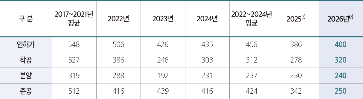 미분양 적체와 매입후 미착공 용지 증가로 주택사업자의 자금여력이 약화된 상태에서 신용도 하락, 규제강화, PF 자금경색, 높은 조달금리 등 민간 주택건설사업 착수가 어려운 상황이다. 내년 공급물량을 예측한 결과 인허가는 40만호, 착공은 LH 등 공공부문 착공물량 증가로 인해 32만호, 분양은 24만호, 준공은 2025년 보다 크게 줄어든 25만호로 예상된다.